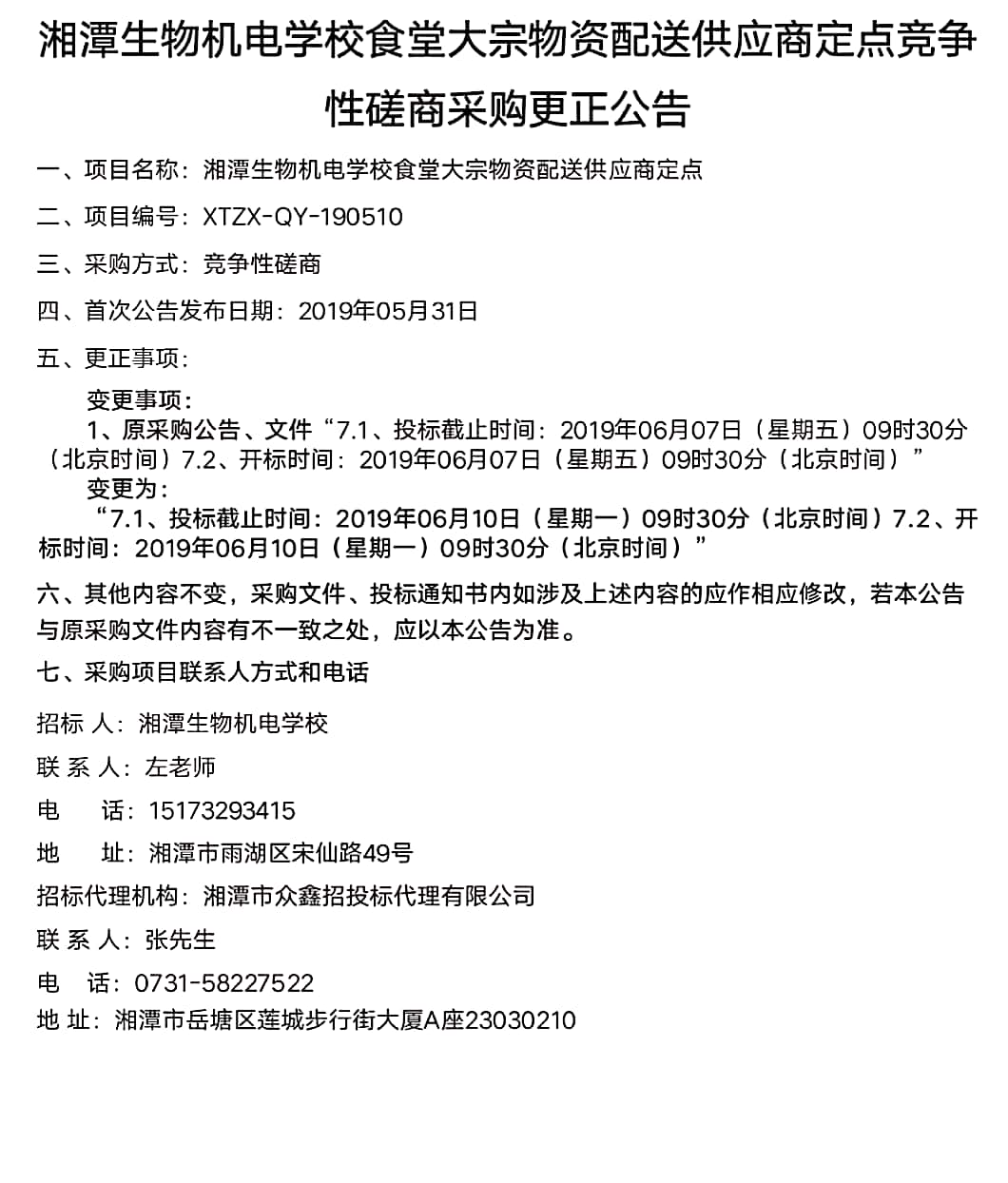 湘潭生物機(jī)電學(xué)校食堂大宗物資配送供應(yīng)商定點(diǎn)競(jìng)爭(zhēng)性磋商采購(gòu)更正公告 發(fā)布時(shí)間:2019-06-06      來(lái)源:湘潭生物機(jī)電學(xué)校