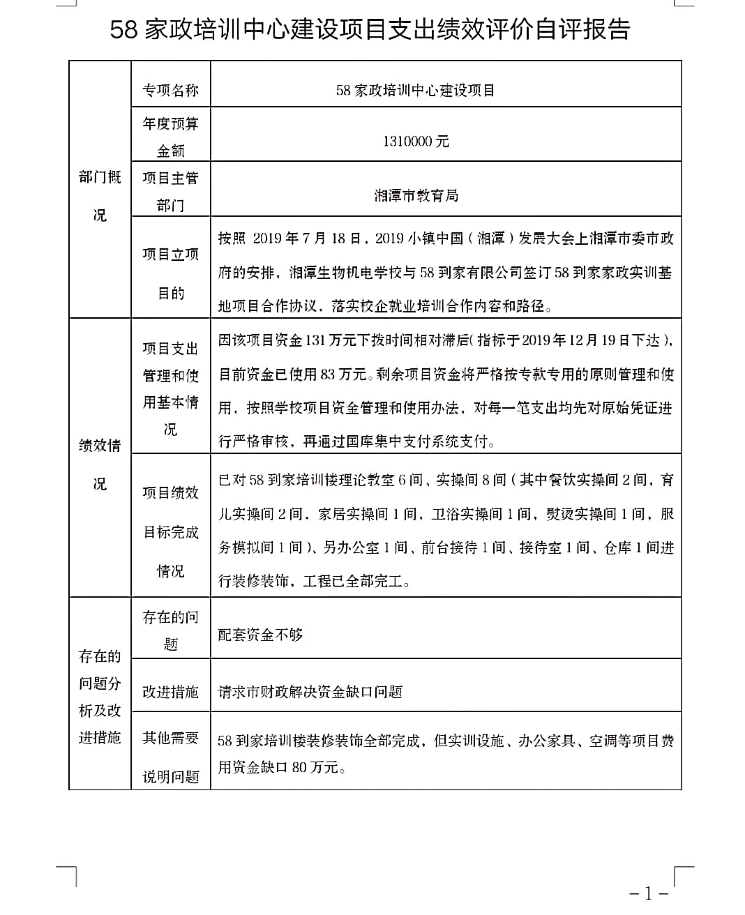 58家政培訓(xùn)中心建設(shè)項目支出績效評價自評報告 發(fā)布時間:2020-05-22      來源:湘潭生物機電學(xué)校