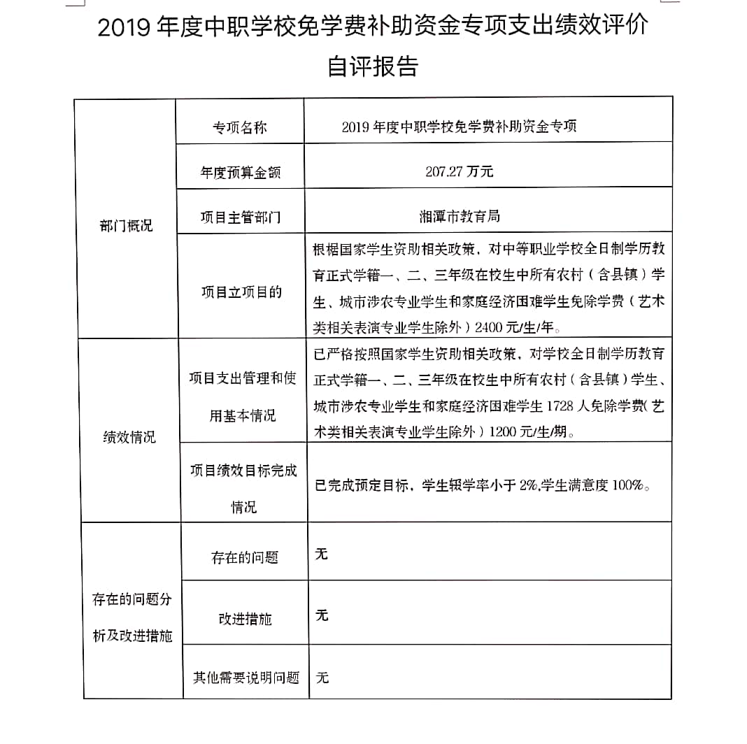 2019年度中職學(xué)校免學(xué)費(fèi)補(bǔ)助資金專項(xiàng)支出績(jī)效評(píng)價(jià) 自評(píng)報(bào)告 發(fā)布時(shí)間:2020-05-22      來(lái)源:湘潭生物機(jī)電學(xué)校